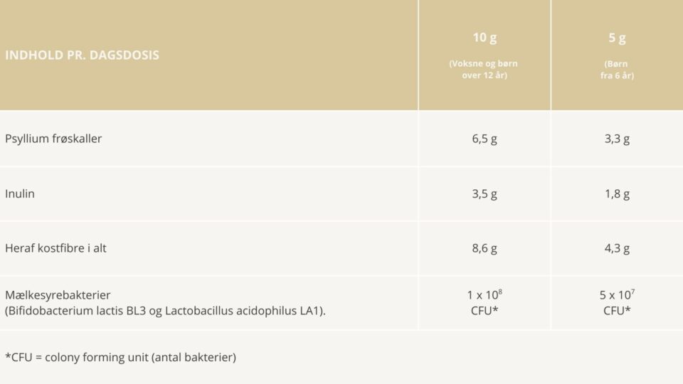 Indeholder naturlige fibre fra psyllium frøskaller. Frøskallerne indeholder 85% kostfibre og opsuger væske, svulmer op, og danner en geléagtig masse. Psyllium frøskaller hjælper til at holde din mave i gang.